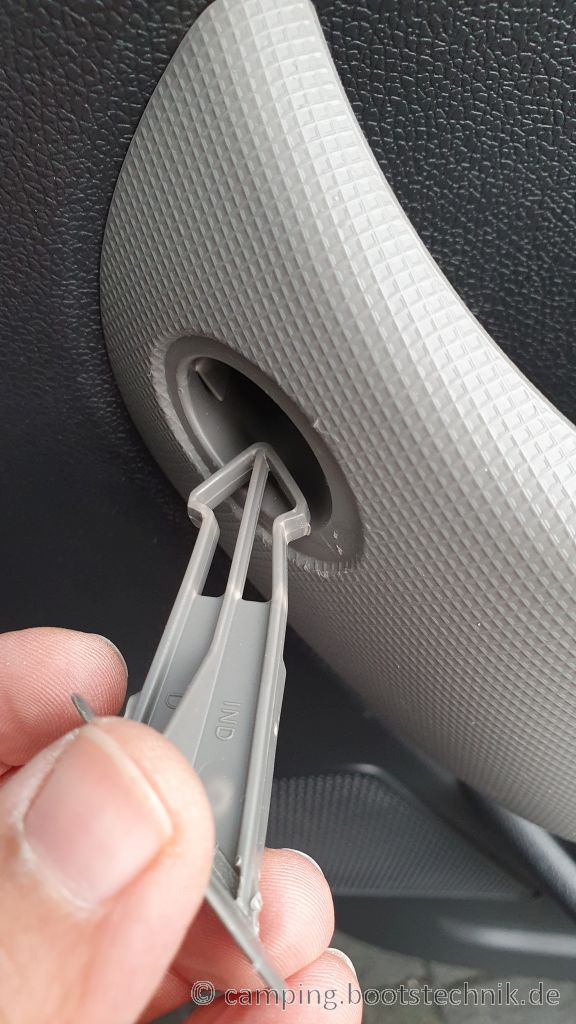 Jetzt löst Du die Türverkleidung, beginnend im unteren Bereich, und arbeitest Dich links und rechts langsam nach oben. Dazu ziehst Du die Verkleidung von der Tür weg. Wenn Du Glück hast, lösen sich die Clips aus der Tür und bleiben heil. Wenn Du noch mehr Glück hast, lösen sich die Clips von der Türverkleidung und bleiben in der Tür, bleiben aber heil. Wenn Du Pech hast, zerreißt es den Clip dabei.