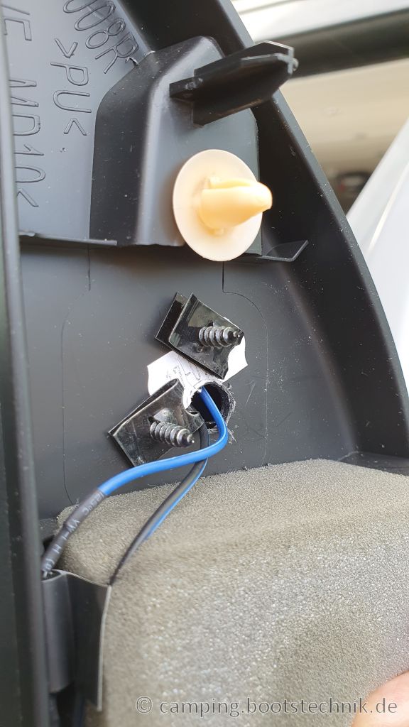 Dann noch den Hochtöner montieren. Das ist nicht schwierig, das Kabel lang genug, und in der Spiegelblende auch genug Platz für die Schrauben. Die beliegenden Blechschrauben sind perfekt: